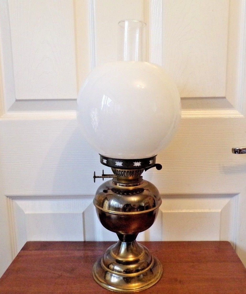 A vintage brass oil lamp with White shade Duplex twin burner working order