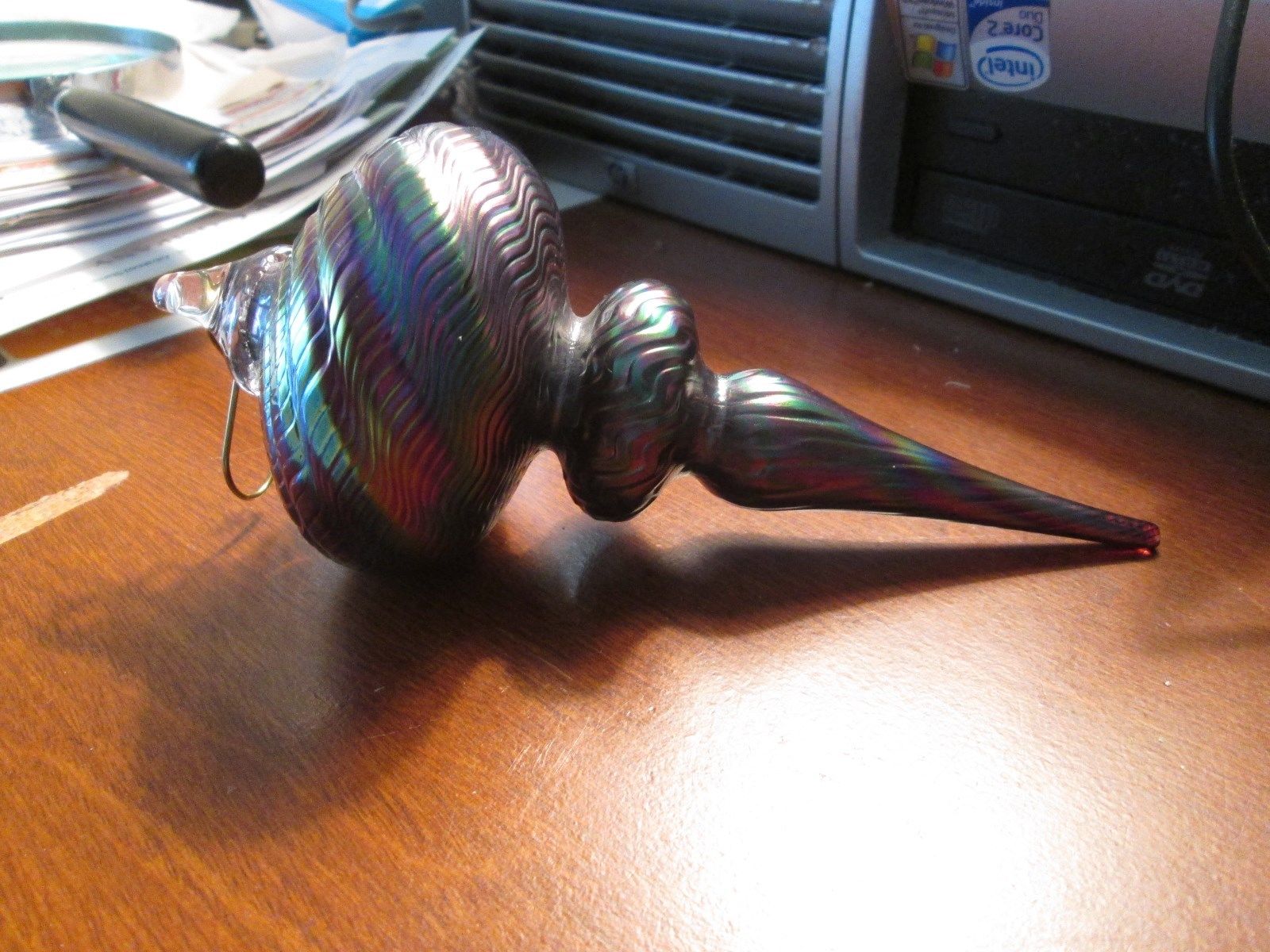 Title (ebay affiliate link): RARE ANTIQUE SPIRAL IRIDESCENT HAND BLOWN ART GLASS SUNCATCHER ORNAMENT