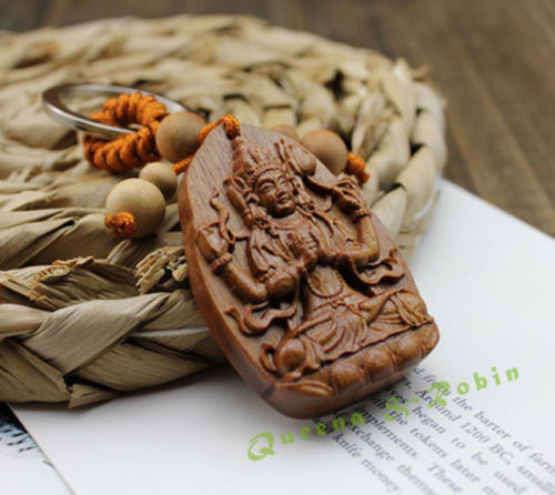 Wood Carved Chinese Four Arms Kwan Yin Statue Sculpture Amulet Pendant Key Chain