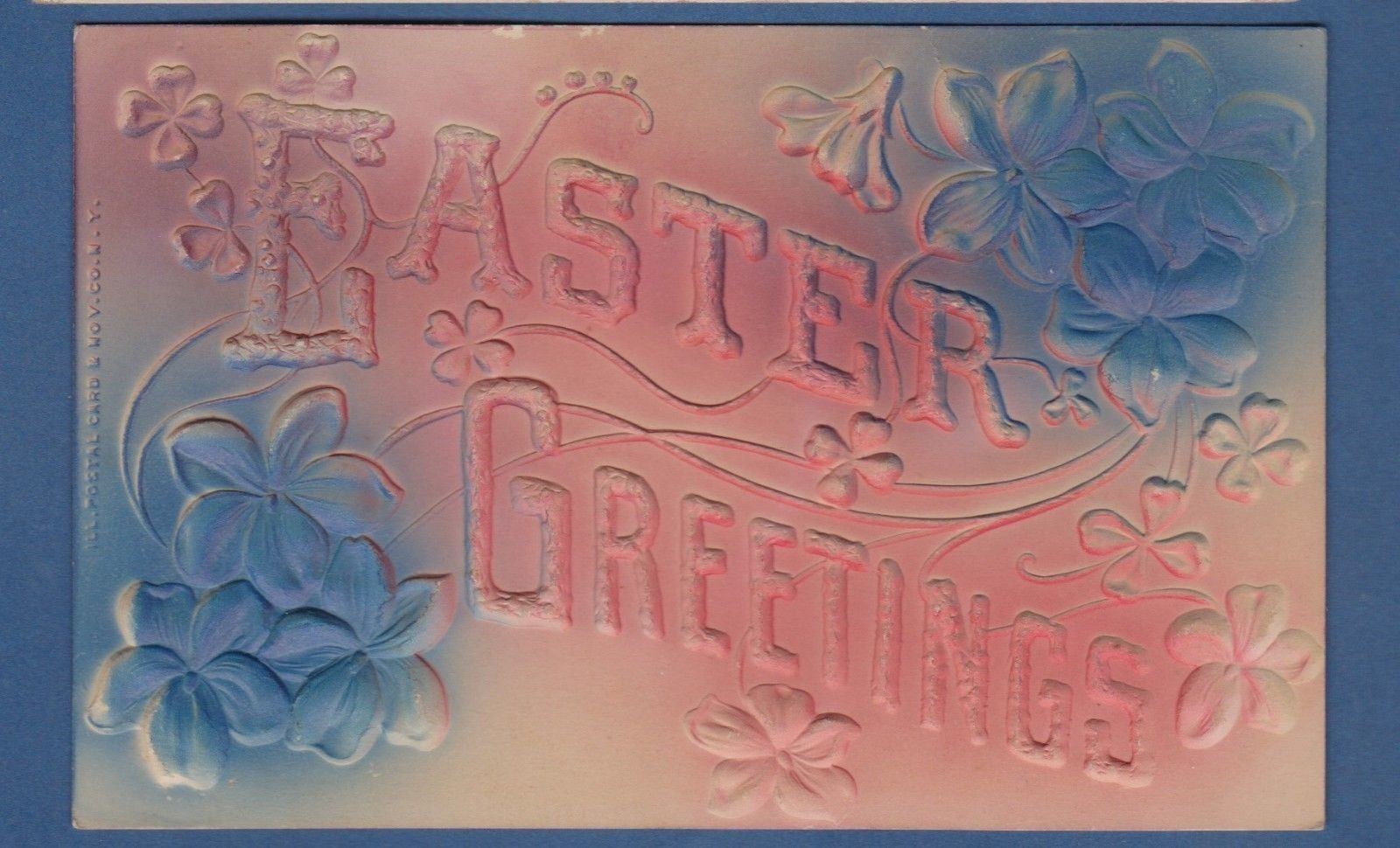 Easter heavily embossed postcard/ airbrushed/ blue flowers/pink lettering
