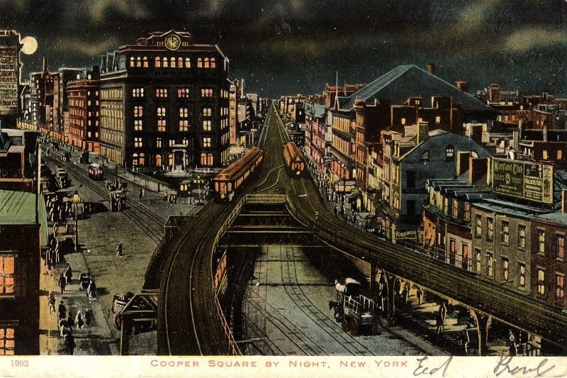 NEW YORK CITY NY, Cooper Square at Night, 1907 Color Vintage Postcard Z2405