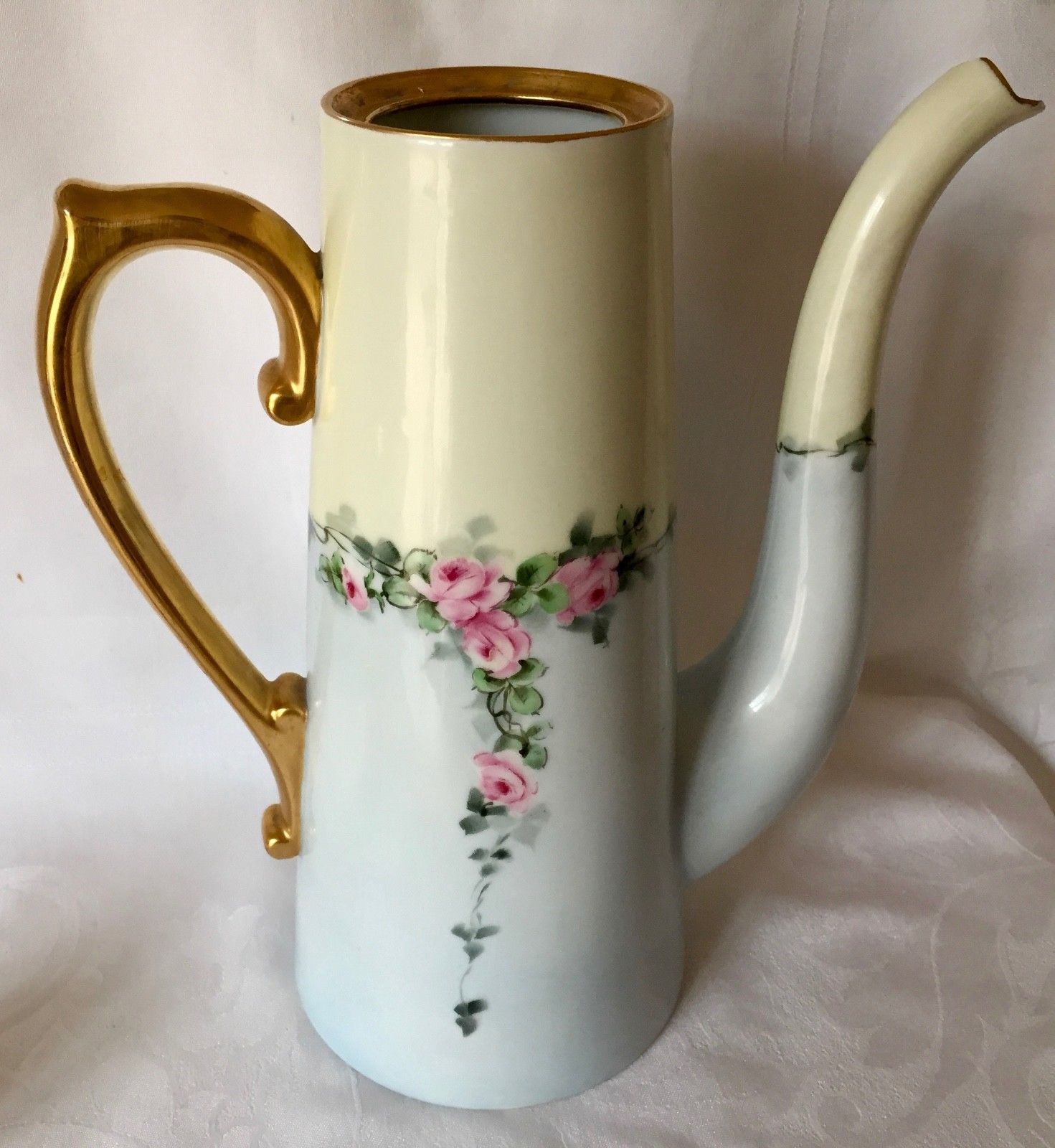 Title (ebay affiliate link): GORGEOUS T&V LIMOGES LARGE PINK & BLUE ARTIST SIGNED COFFEE POT, NO LID, DAMAGED