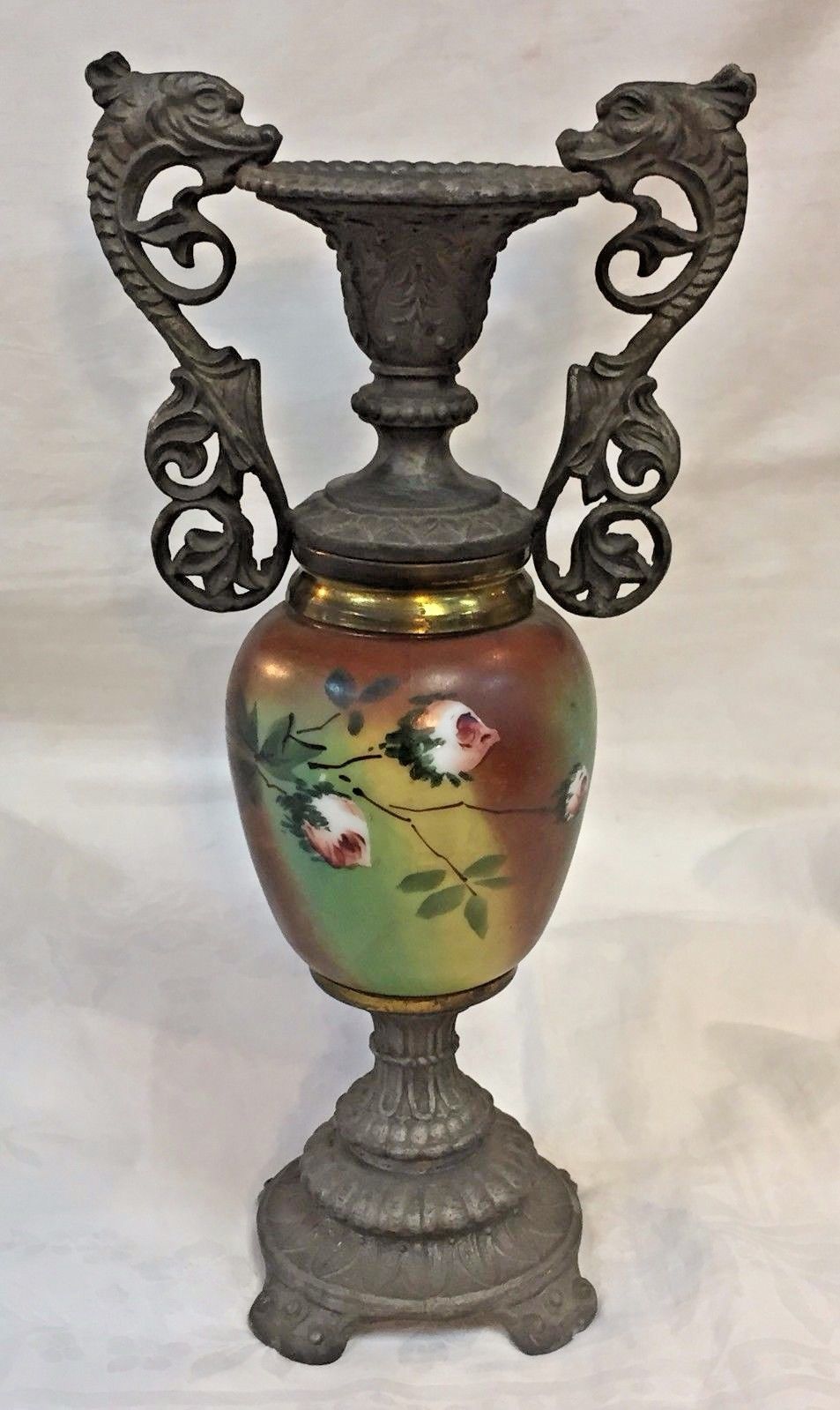 Title (ebay affiliate link): Victorian Hand Painted Porcelain Amphora Candlestick with Metal Dolphin Handles