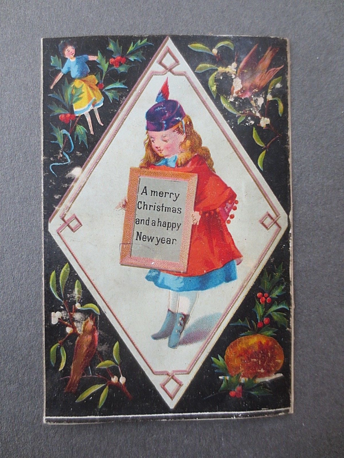 Antique Christmas Card 1870s Little Girl Red Coat Doll Robins Pudding Holly