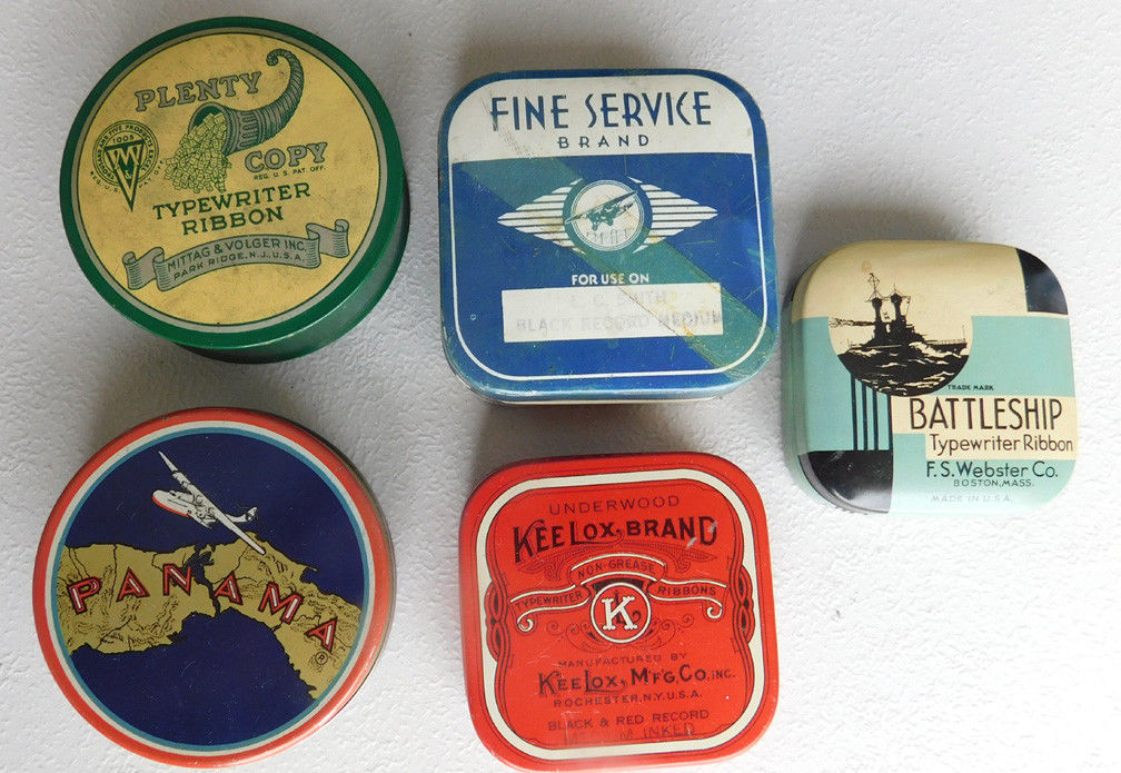 FIVE DIFFERENT VINTAGE TYPEWRITER RIBBON TINS/BOXES