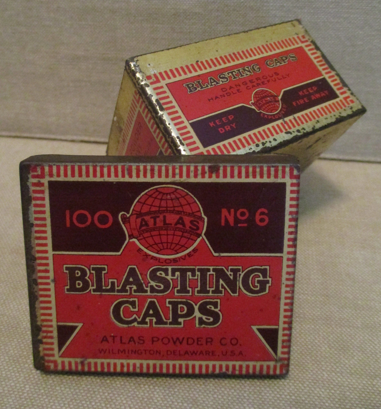 Title (ebay affiliate link): Vintage Advertising Tin-ATLAS POWDER-NO.6-BLASTING CAPS Can-Explosive-Mining