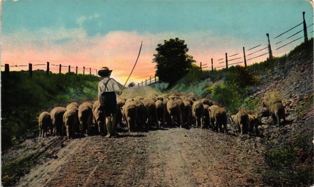 DR JIM STAMPS US POSTCARD BOY WITH HERD OF SHEEP ON DIRT PATH