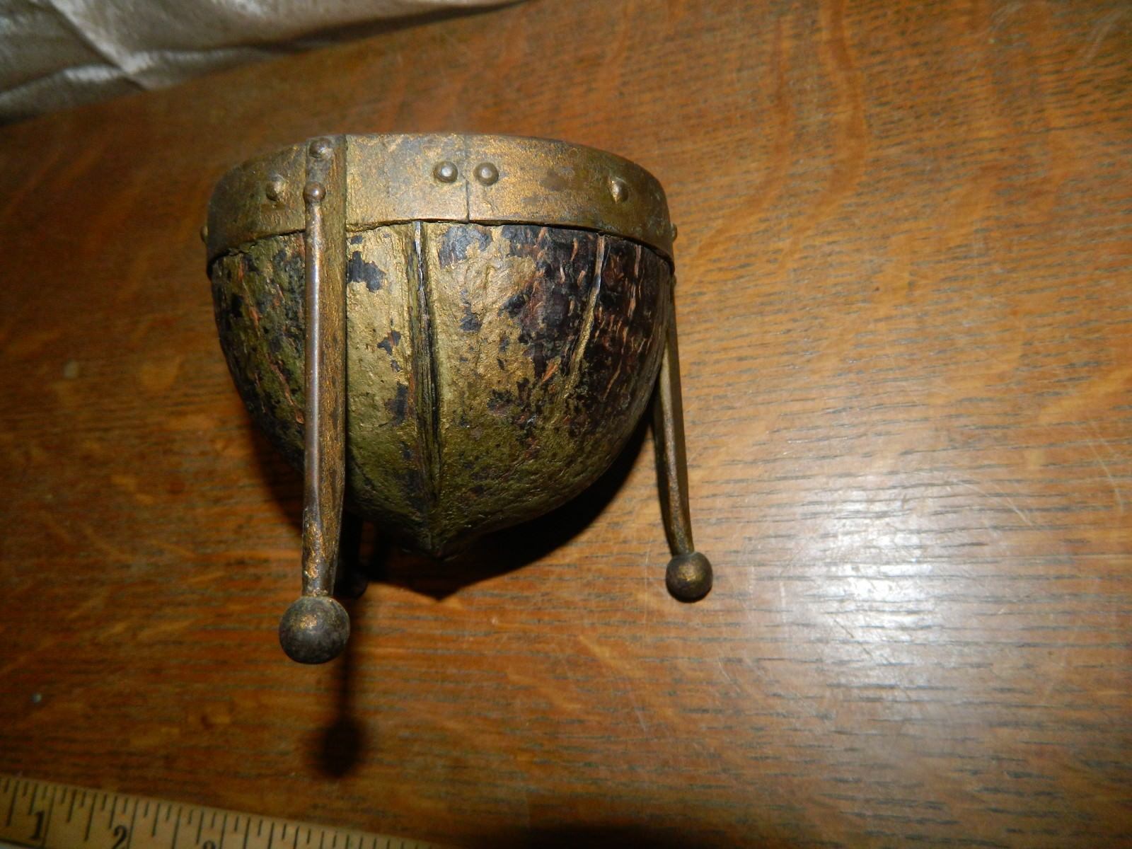 Title (ebay affiliate link): Primitive Antique Hand Made Brass Tri Footed Wood Shell Drinking Cup