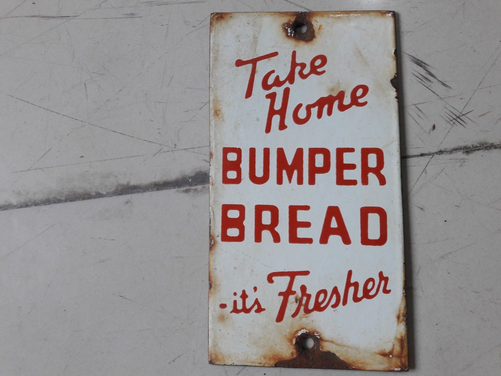 Title (ebay affiliate link): Bumper Bread Porcelain sign measures 4" x 8" Inches Pre-Owned