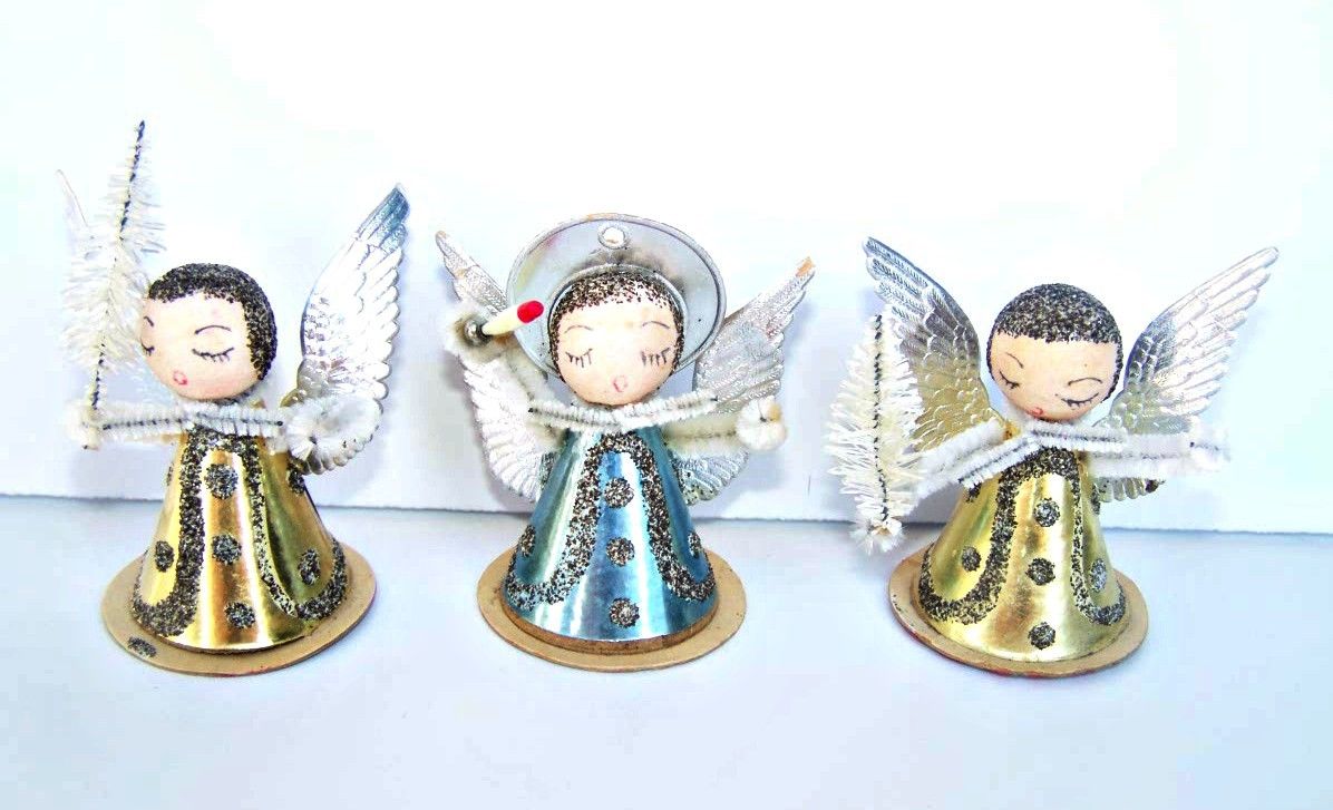 Title (ebay affiliate link): 3 Vtg Spun Cotton Chenille Foil Bottle Brush Tree Christmas Angels With Mica