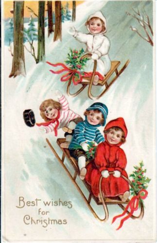 Title (ebay affiliate link): Children sledding down snow hill, in wooden Sleds, trimmed with Holly. 1902 PC
