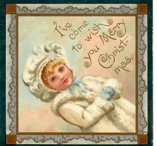 Title (ebay affiliate link): Small Girl, in White Fur Coat, with blue Gloves. Art Nouveau Louis Prang Xmas