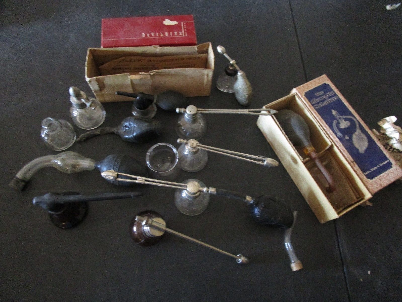 Title (ebay affiliate link): HUGE LOT OF ANTIQUE ATOMIZERS, NEBULIZERS, KANTLEEK, DEVILBISS, GLASEPTIC