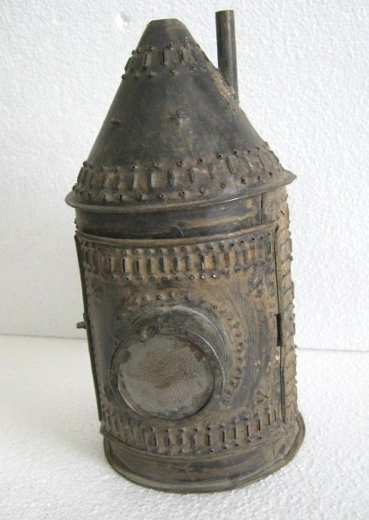 Title (ebay affiliate link): ANTIQUE PUNCHED TIN CANDLE HOLDER / LANTERN WITH TWO GLASSES