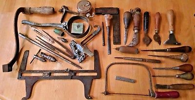 Title (ebay affiliate link): Lot of Miscellaneous Tools Saw Leather Tools Awl Gimlet Dividers Chisel Tape Mea