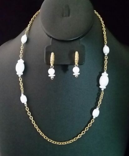 Title (ebay affiliate link): VTG MILK GLASS BEAD NECKLACE Gold Plated Chain Link 21.5" + Gold Dangle Earrings