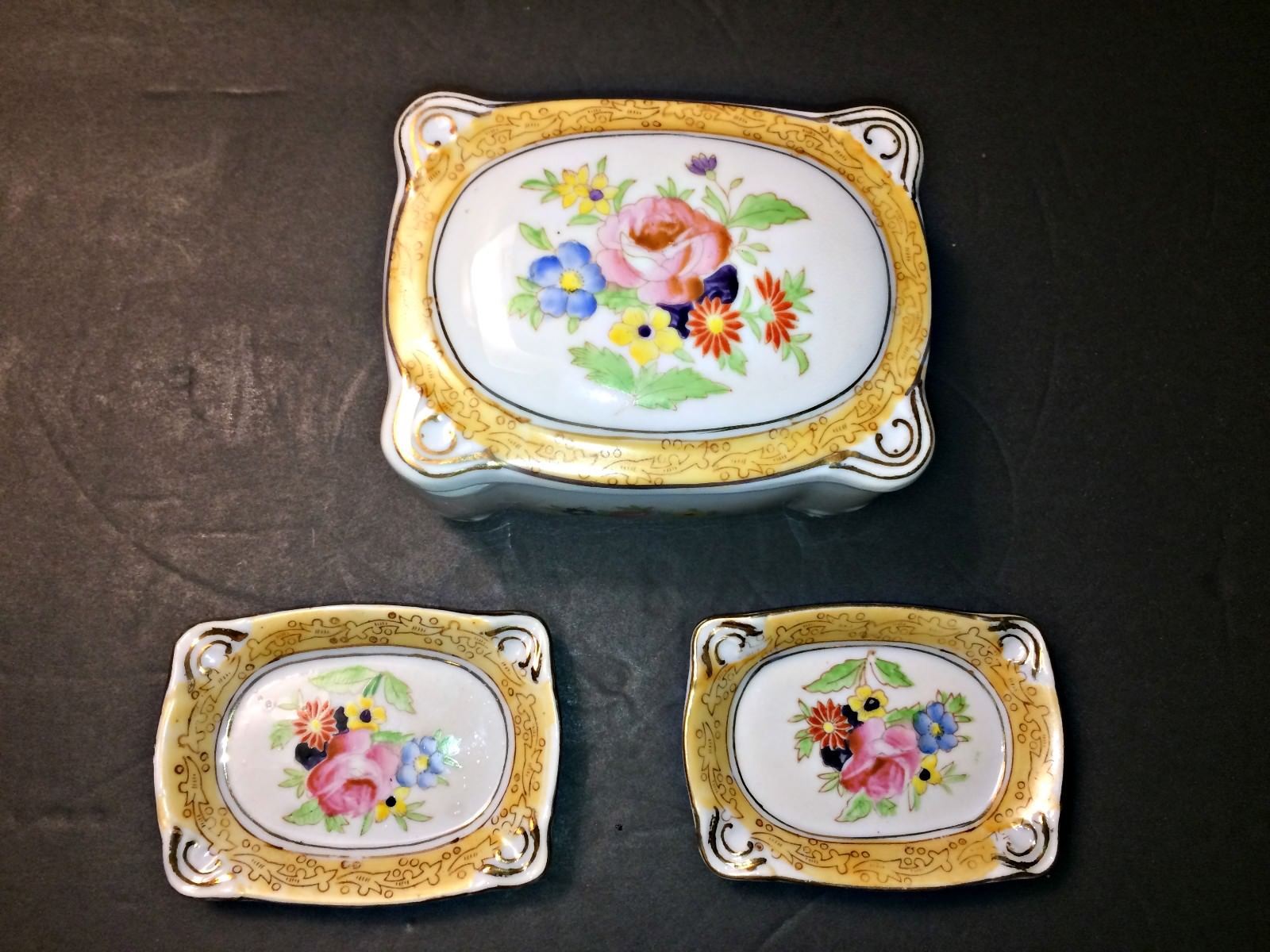 VTG Rosetti Floral Cigarette Trinket Box Occupied Japan w/ashtrays Hand painted.