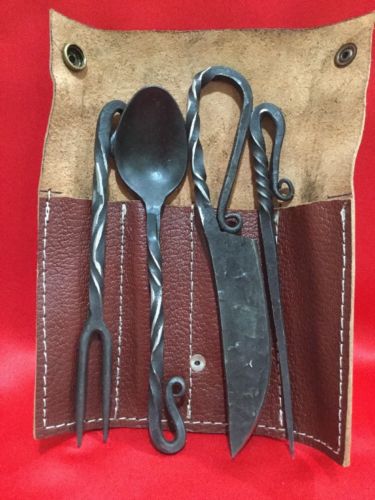 Title (ebay affiliate link): Vtg Wrought Iron Metal Hand Made Utensil Set Fork Knife Pick Spoon In Leather