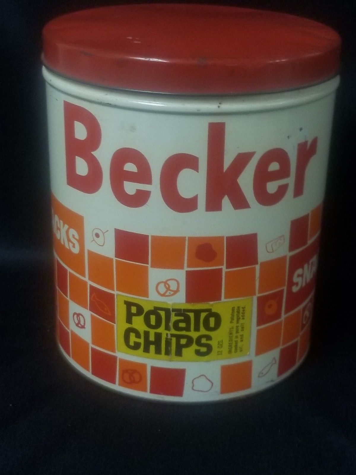 Title (ebay affiliate link): Vintage Becker Pretzel Bakeries Inc Tin Metal Can Baltimore, Md. & Columbia Pa