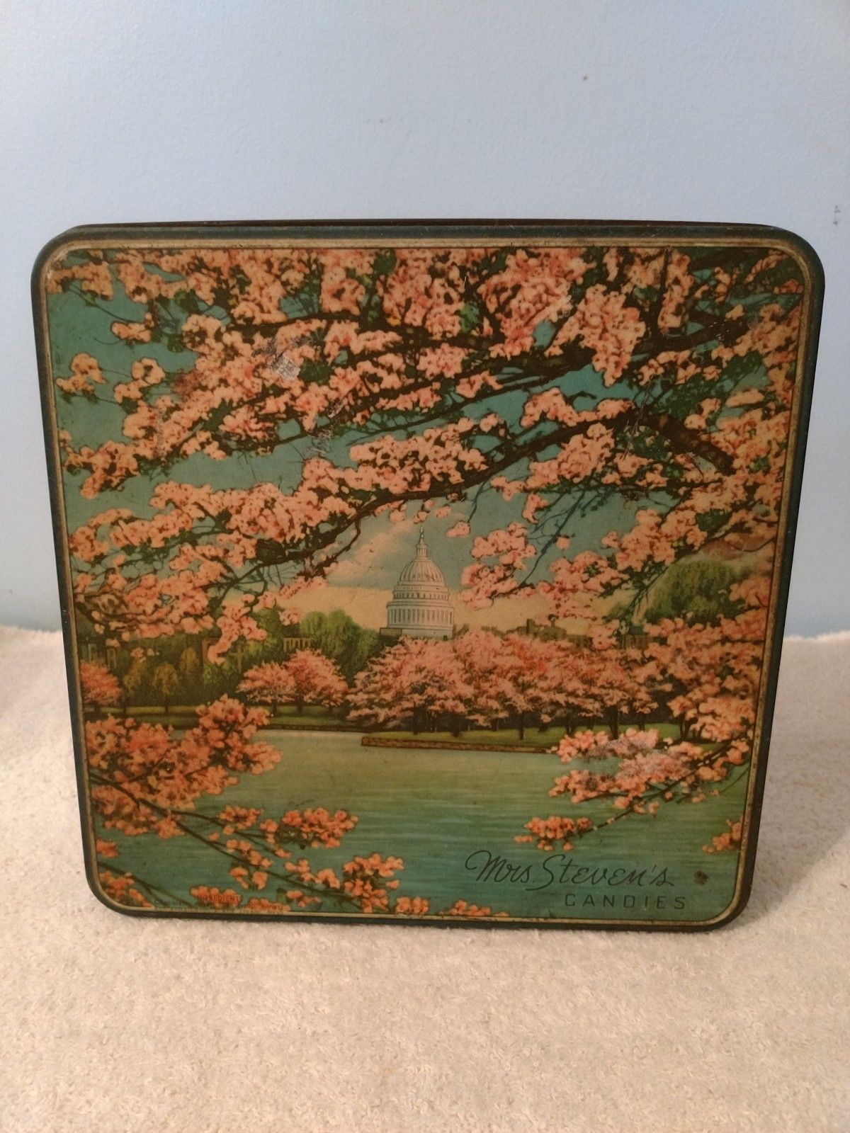 Title (ebay affiliate link): Vintage Mrs. Stevens Candies White House Cherry Blossom Tin