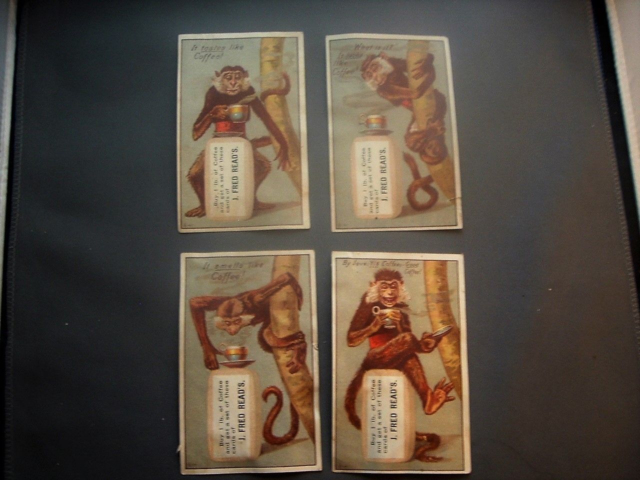 4 Victorian trade cards J. Fred Read''s Coffee monkeys