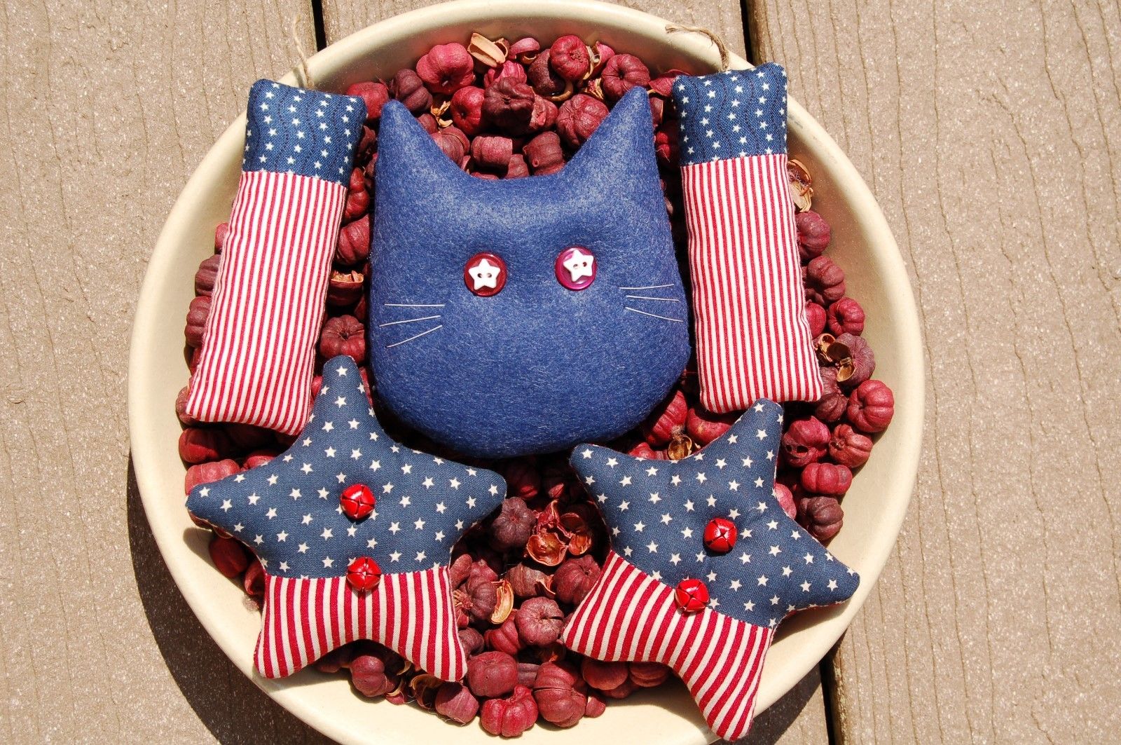 Primitive Americana Cat, Firecrackers & Stars Ornies, Bowl Fillers
