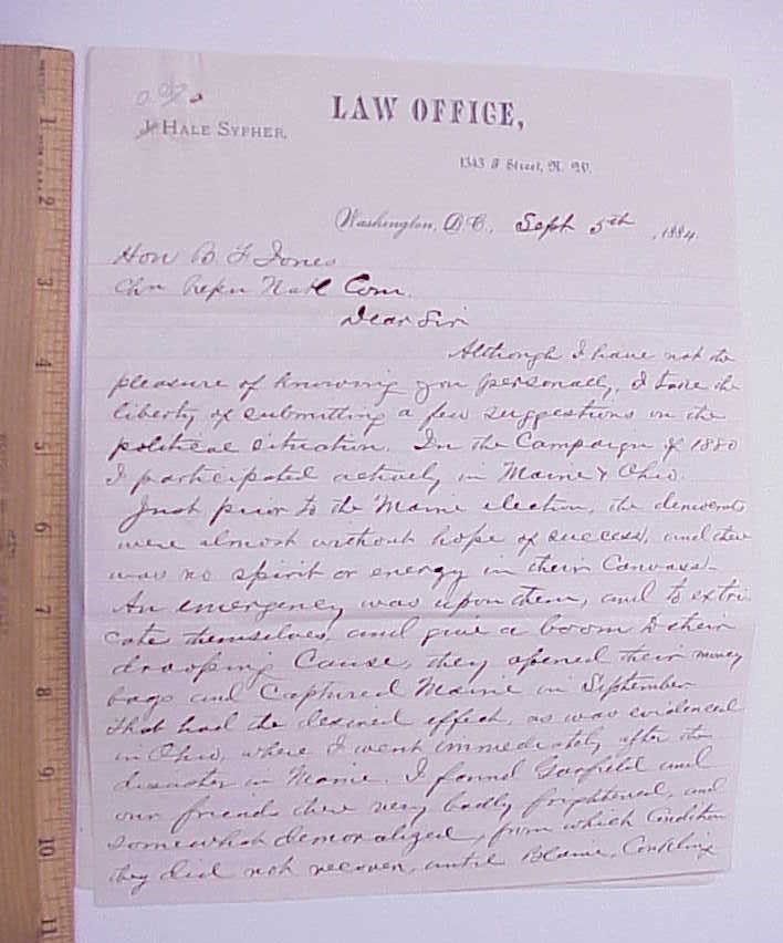 ORIG 1884 Blaine Presidential Campaign Letter Louisiana Congressman Hale Sypher
