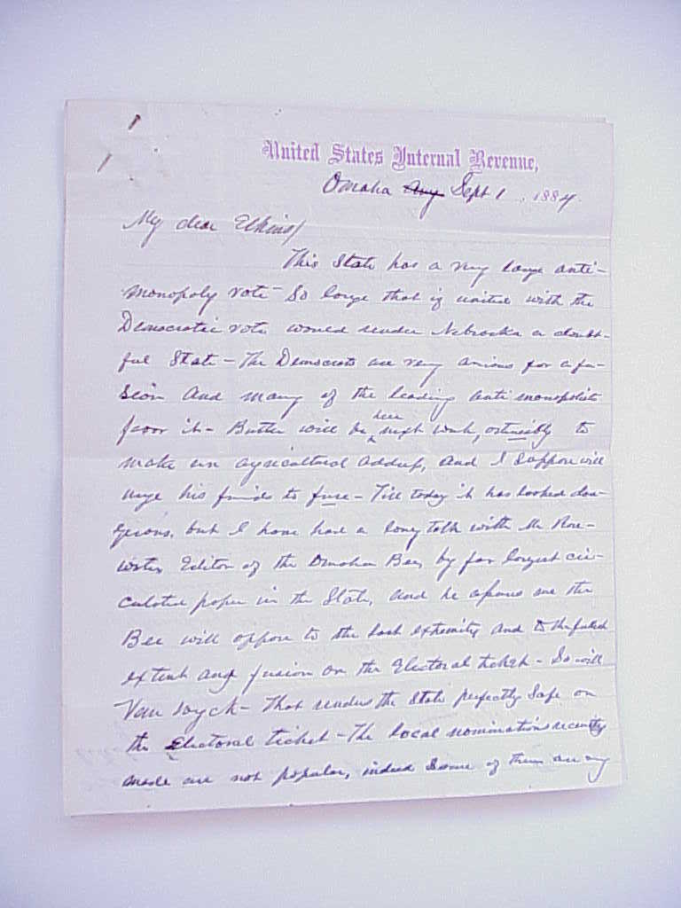 1884 Blaine Logan Presidential Campaign Letter Omaha Nebraska "Anti-Monopoly"