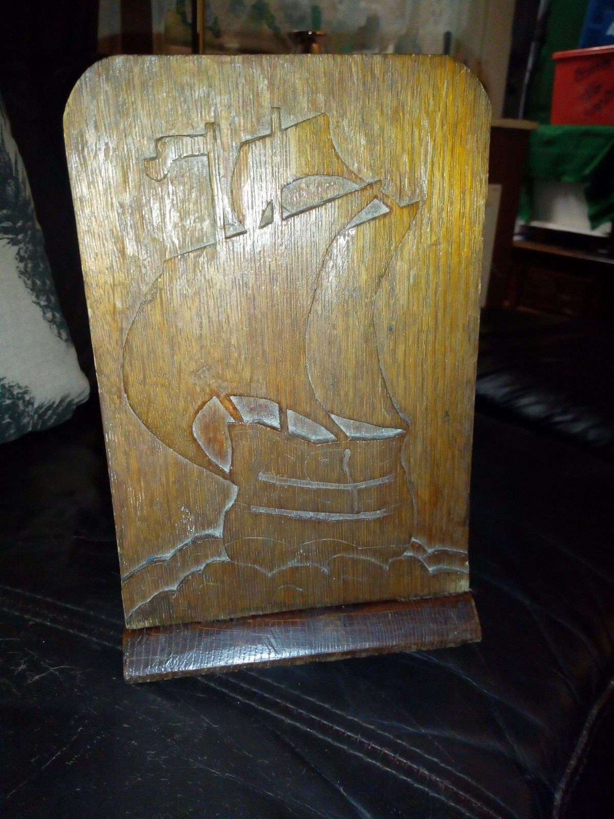 Title (ebay affiliate link): Superb Large Oak Arts & Crafts hand carved 3D ship Galleon book stand Treen