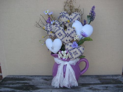 Title (ebay affiliate link): Prim Antique Woven Coverlet Hearts in a Ceramic Pitcher Floral Table Arrangement