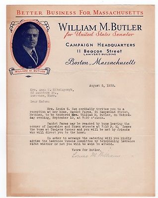 Title (ebay affiliate link): 1930 William M. Butler for U.S. Senate, Massachusetts Campaign Letter