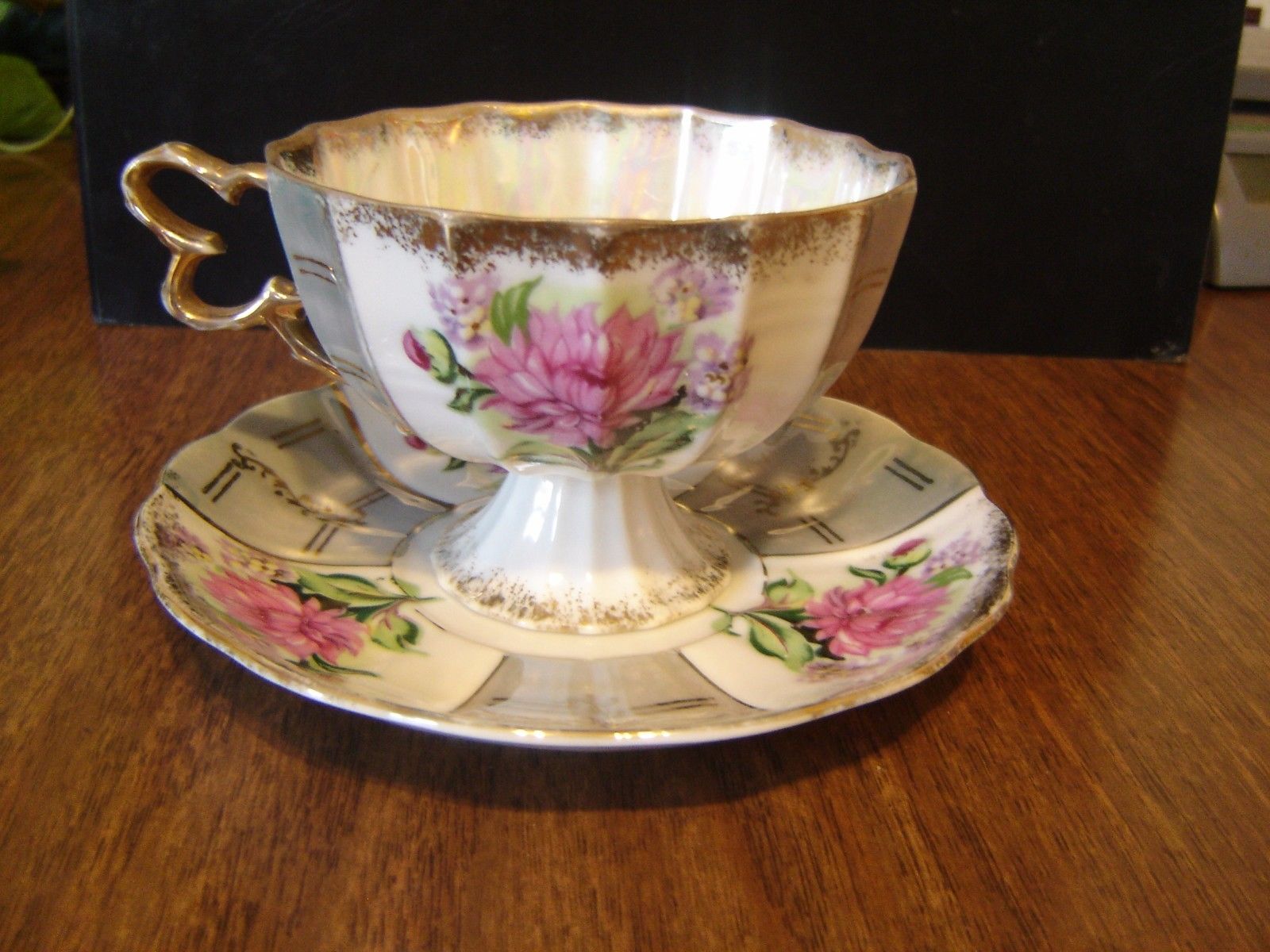 Vintage Cup Saucer Set Luster Iridescent Gold Handle Trim.