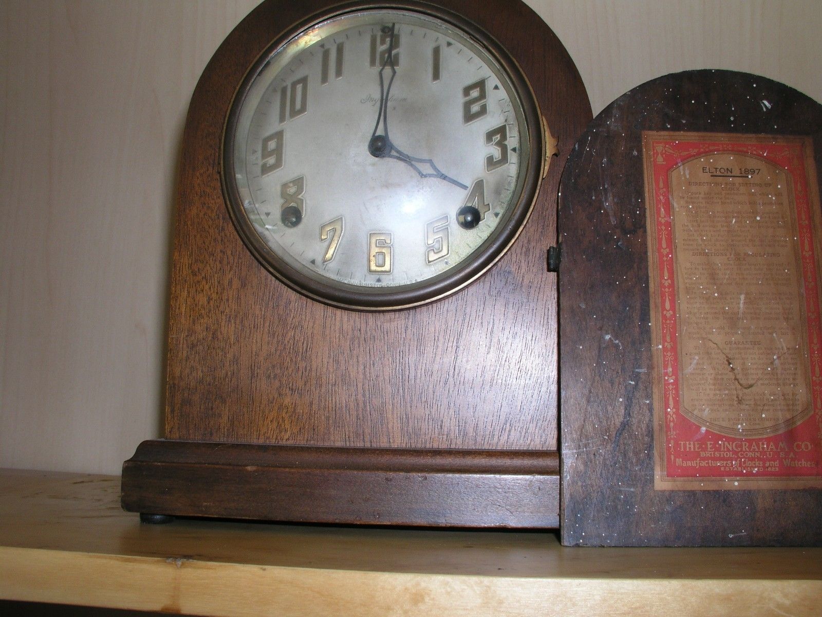 Title (ebay affiliate link): Antique E-Ingraham-Shelf/Kitchen Clock. Runs & Chimes. Un-Restored original