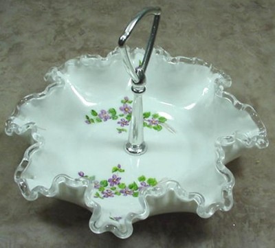 Milk Glass White Ruffle Edge Candy Dish Purple Violets