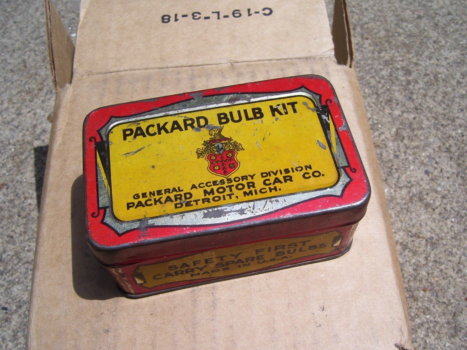 Vintage original PACKARD automobile bulb kit tin box can motor car company 40s
