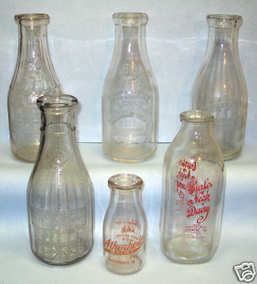 LOT OF 6 ASSORTED VINTAGE CLEAR GLASS MILK BOTTLES