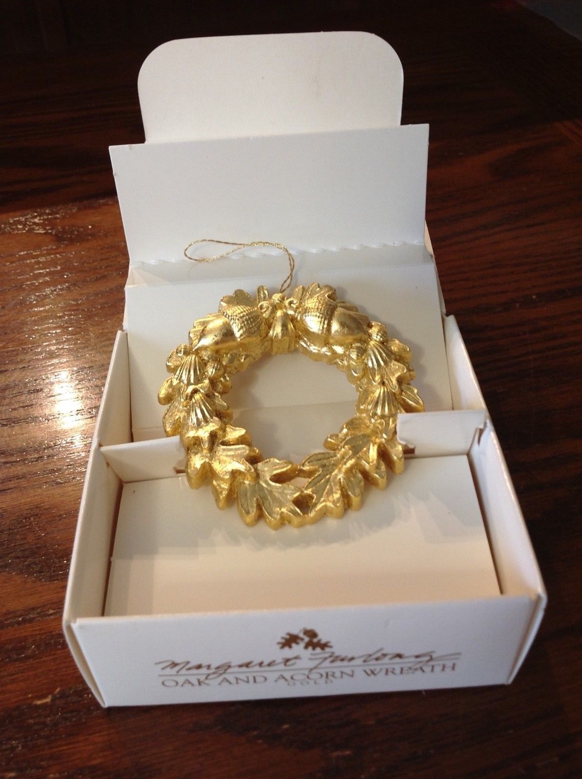 Title (ebay affiliate link): Vintage Margaret Furlong Gold Oak and Acorn Wreath Ornament 1996 3" In Box