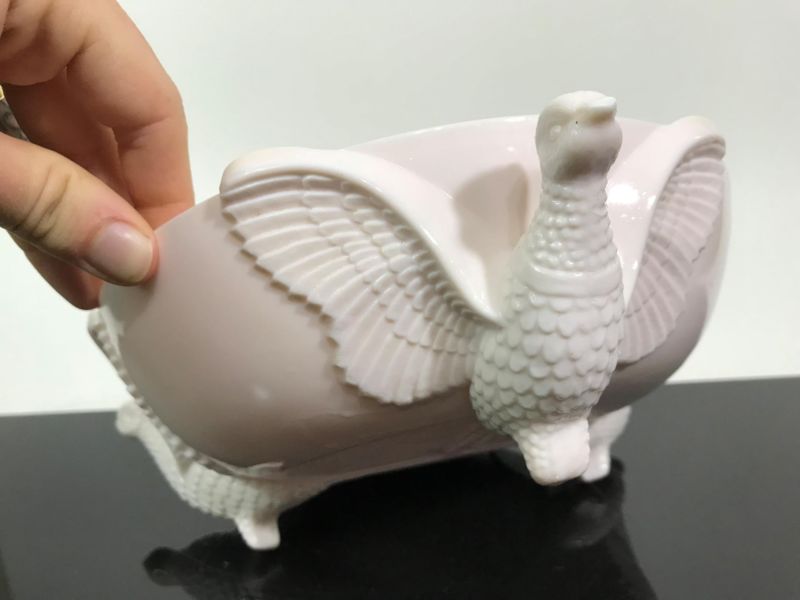 Title (ebay affiliate link): RARE Vintage Pink Milk Glass Winged Bird Footed Serving Bowl