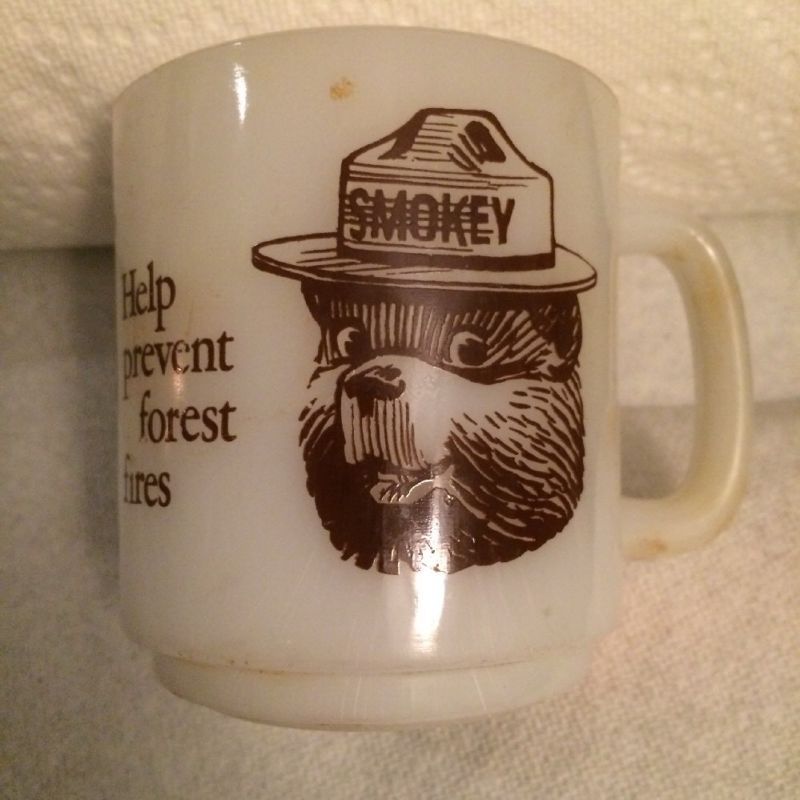 Title (ebay affiliate link): VINTAGE GLASBAKE MILK GLASS SMOKEY BEAR HELP PREVENT FOREST FIRES