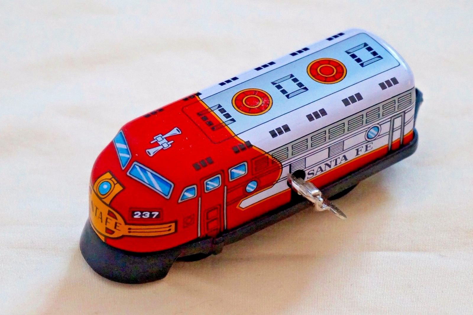 Title (ebay affiliate link): JAPAN Vintage Sanko Tin Toy Lithographed Wind up SANTA FE 4" Train Locomotive