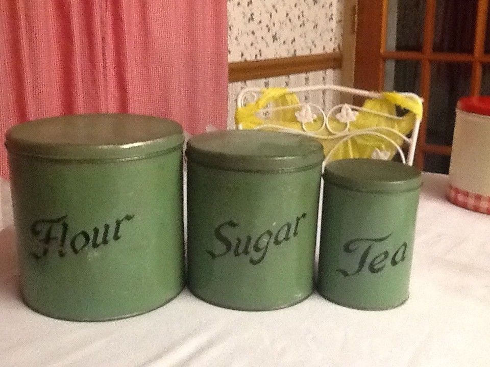 Vintage Kitchen, Green, Metal, Tin Canisters.