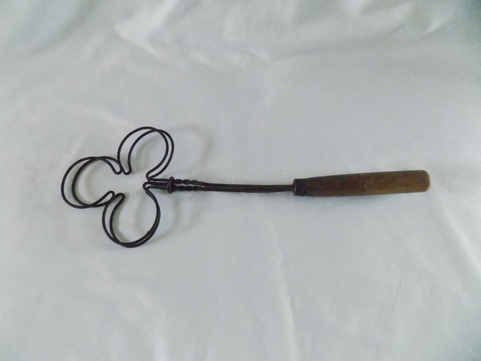 Title (ebay affiliate link): VINTAGE CLOVER SHAPED TWISTED METAL FRAME WIRE RUG BEATER WITH WOOD HANDLE.