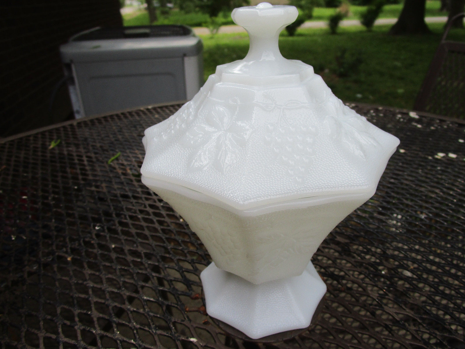 Title (ebay affiliate link): Anchor Hocking Milk Glass Grape & Leaf Pattern Candy Dish With Lid