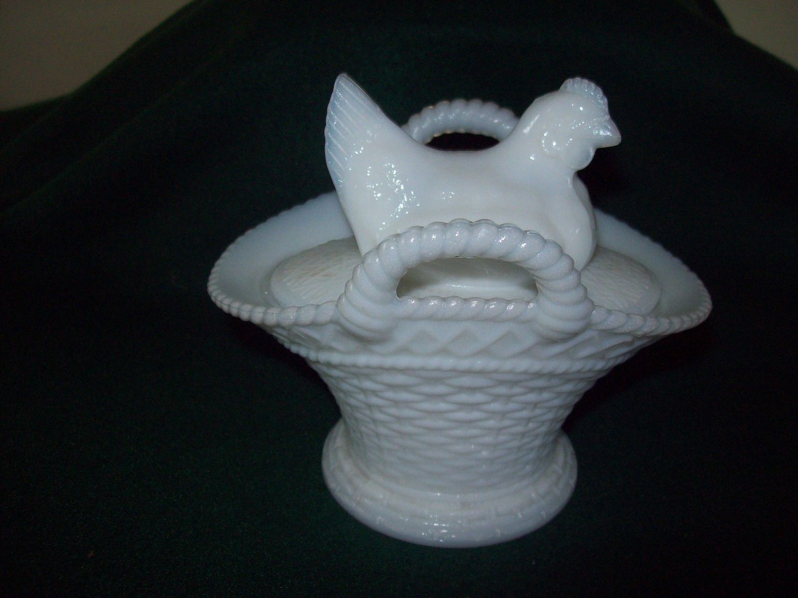 WESTMORELAND MILK GLASS HEN ON RAISED BASKET