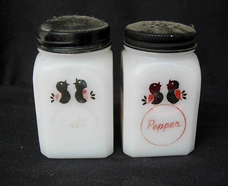 Vint S & P Milk Glass SHAKERS with 2 SINGING BLACKBIRDS