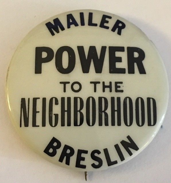 Title (ebay affiliate link): Uncommon 1 1/2" Norman Mailer-Jimmy Breslin Power to the Neighborhood Pin