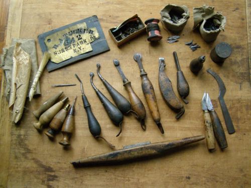 19thC LEATHER CRAFT COBBLER TOOLS RARE EDGE SOLE PLANE WHEELS SHAVE VICE AWLS