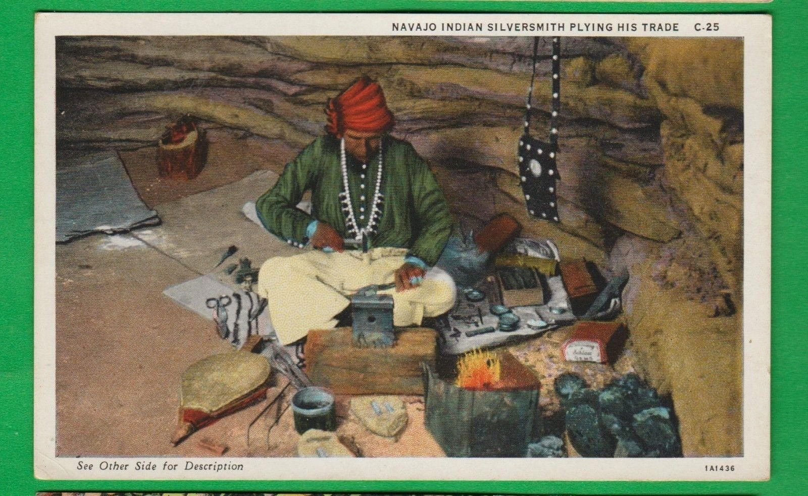 Title (ebay affiliate link): Navajo Indian Silversmith/ Da Pah/ working/ non-linen postcard