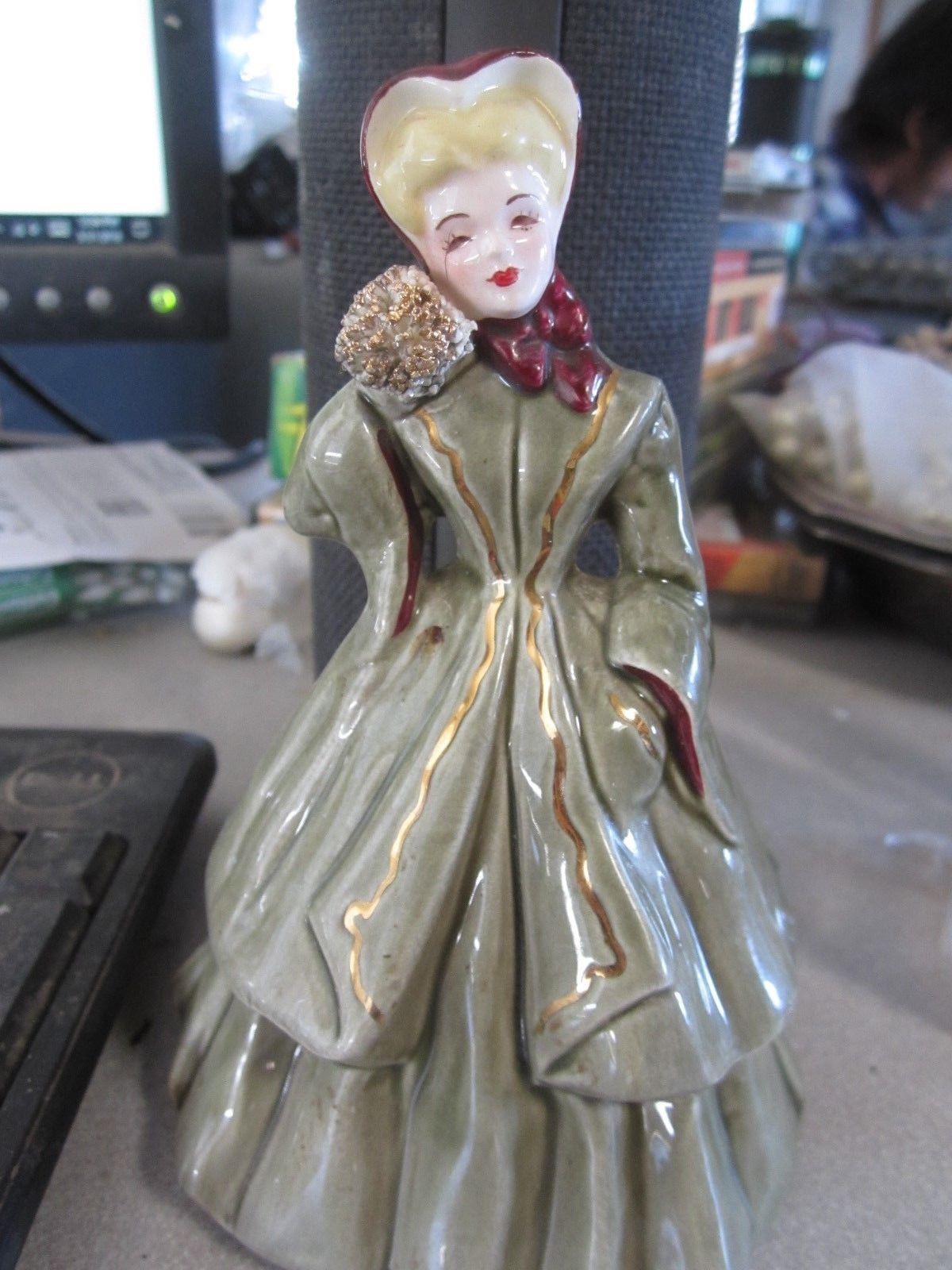 Title (ebay affiliate link): "Irene" by Florence Ceramics Pasadena, CA Figurine Lady w/Hand Muff gold accent