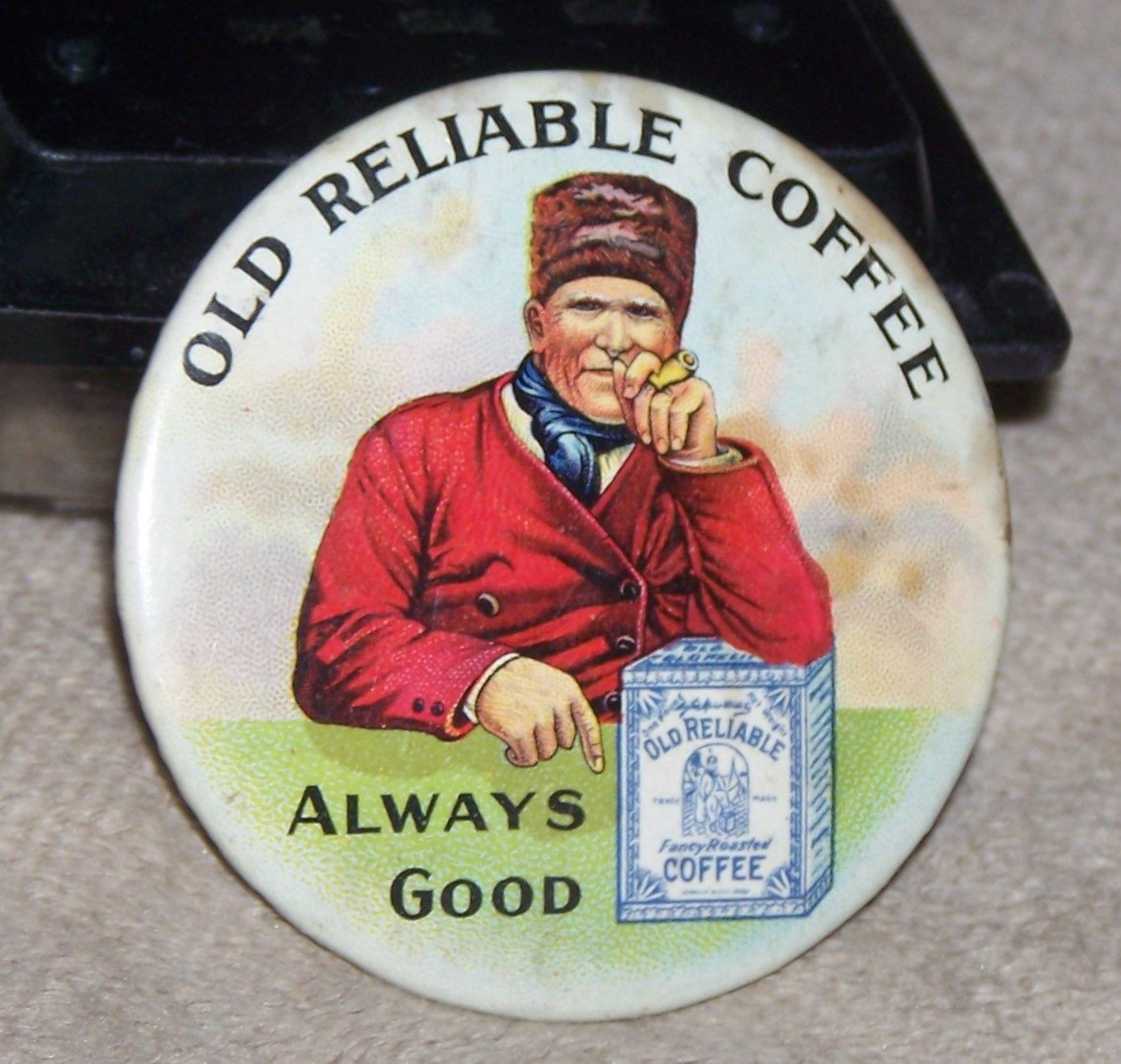 VINTAGE OLD RELIABLE COFFEE ~Advertising Celluloid Pocket Mirror~ 2" DIAMETER